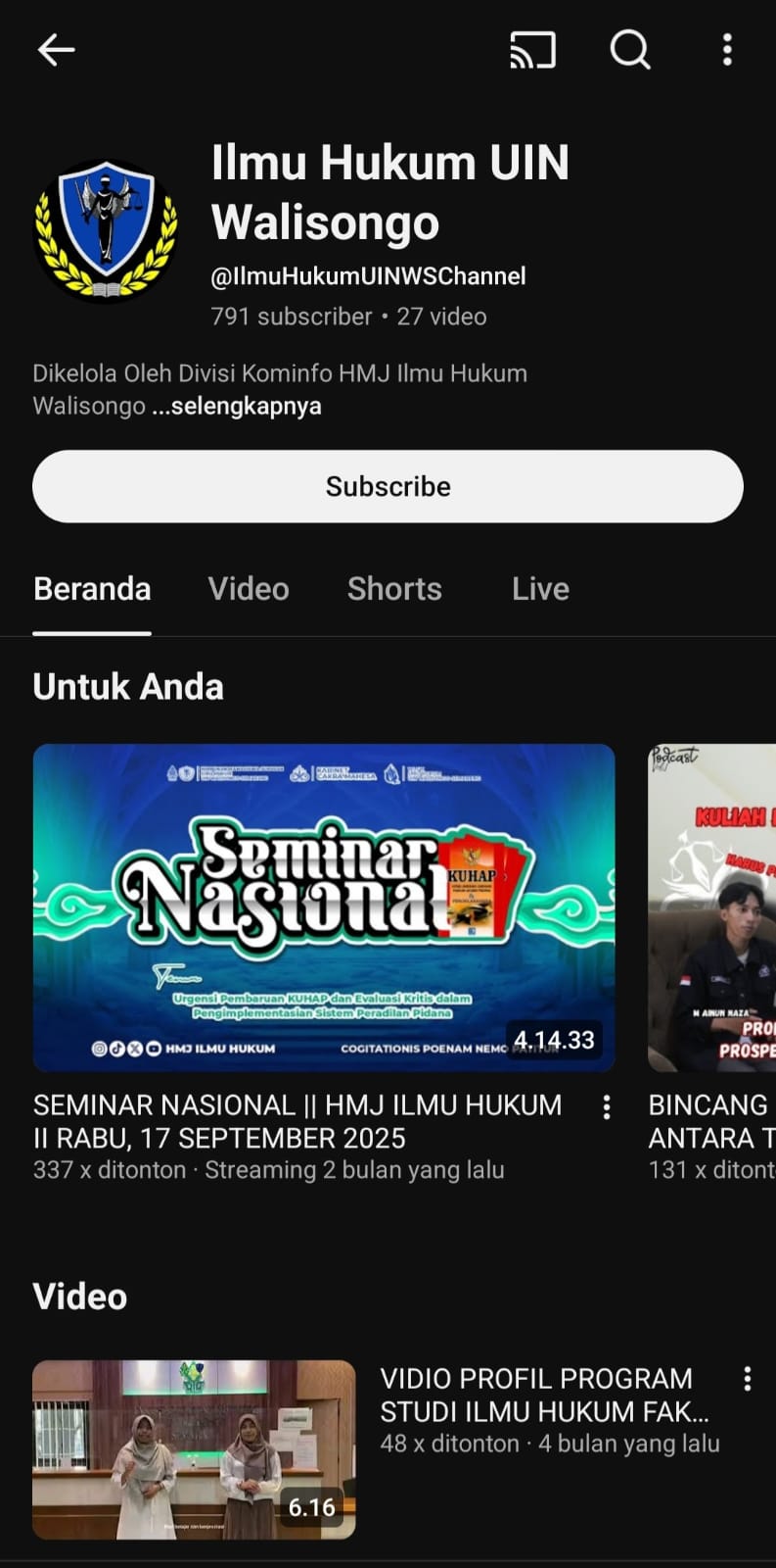 Himpunan Mahasiswa Jurusan (HMJ) Ilmu Hukum UIN Walisongo adalah organisasi kemahasiswaan yang berfungsi sebagai pelaksana program kemahasiswaan di tingkat jurusan Ilmu Hukum. HMJ ini berada di bawah koordinasi SEMA dan DEMA dan memiliki kepengurusan yang terdiri dari ketua, wakil ketua, sekretaris, bendahara, serta departemen atau bidang sesuai kebutuhan. Ketua HMJ dipilih langsung melalui pemilihan mahasiswa (PEMILWA).Tugas utama HMJ Ilmu Hukum UIN Walisongo meliputi penyusunan dan pelaksanaan program kerja yang mendukung kegiatan jurusan, pengusulan program kerja kepada Senat Mahasiswa Fakultas untuk mendapatkan pengesahan, serta pertanggungjawaban pelaksanaan program kerja kepada dekan melalui Senat Mahasiswa Fakultas. Selain itu, HMJ juga mengkoordinasikan berbagai program studi dalam jurusan yang dapat membantu meningkatkan kinerja HMJ.HMJ Ilmu Hukum UIN Walisongo juga aktif mengadakan kegiatan seperti seminar nasional dan pembinaan pemahaman profesi hukum untuk mahasiswa, yang menjadi wadah bagi mahasiswa untuk mengembangkan kapasitas akademik dan organisasi dalam bidang hukum. Organisasi ini menjadi ruang bagi mahasiswa Ilmu Hukum untuk bersinergi dalam mengembangkan ilmu dan berkontribusi dalam lingkungan kampus secara positif